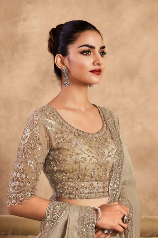 Grey Gold Flake Designer Silk Saree With Fancy Work