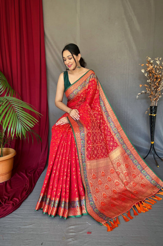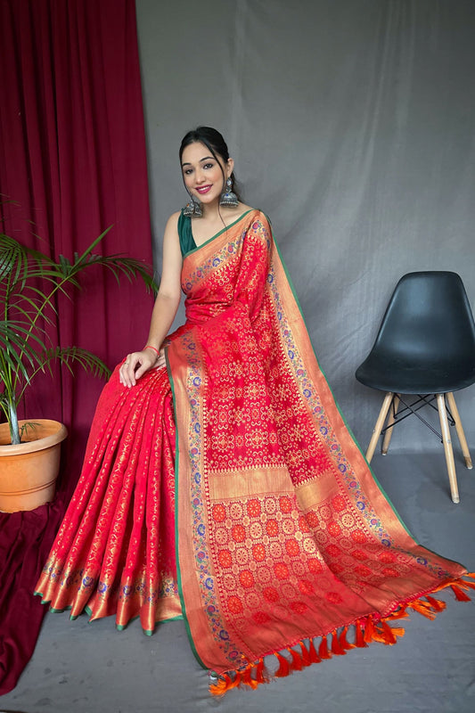 Tomato Red Patola Silk Saree with Paithani Patola Fusion