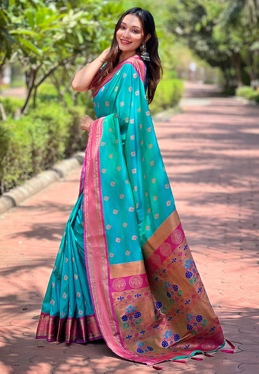 Sky Blue Contrast Zari Woven Peacock Yeola Paithani Silk Saree