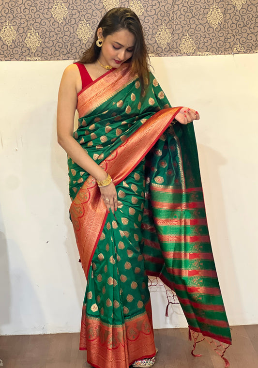 Green Soft Silk Floral Border Contrast Zari Woven Saree