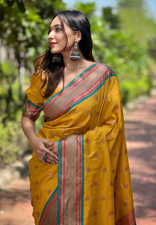 Gold Contrast Zari Woven Peacock Yeola Paithani Silk Saree