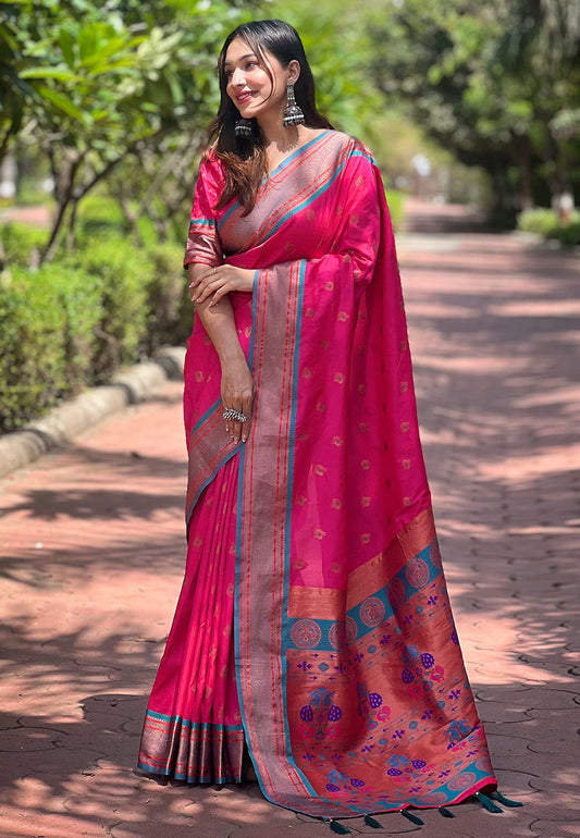 Hot Pink Soft Silk Floral Border Contrast Zari Woven Saree