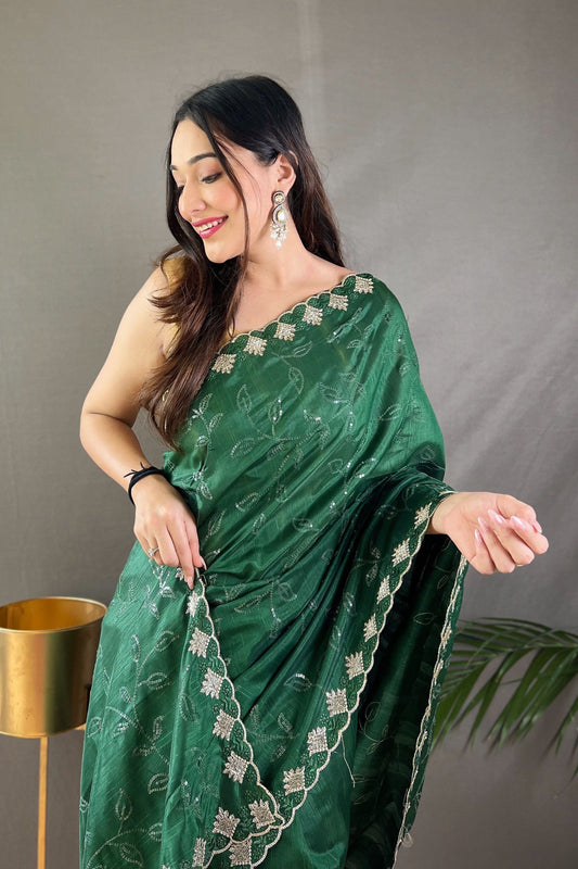 Dark Green Sequins Work Silk Saree with Embroidered Border