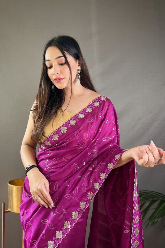 Purple Sequins Work Silk Saree with Embroidered Border