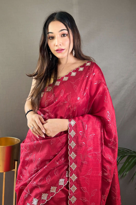 Crimson Red Sequins Work Silk Saree with Embroidered Border