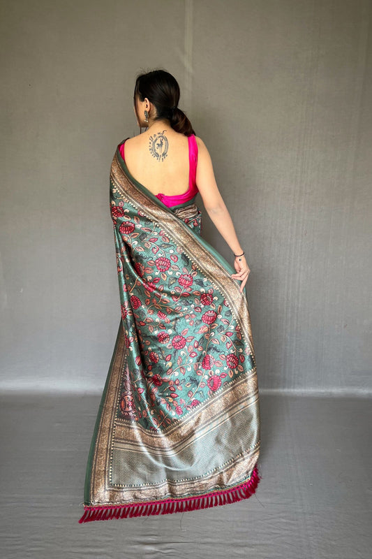 Steel Grey Soft Silk Saree with Kalamkari Fusion Print