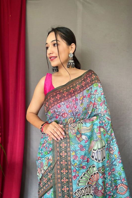 Mint Green Kalamkari Printed Malai Cotton Saree