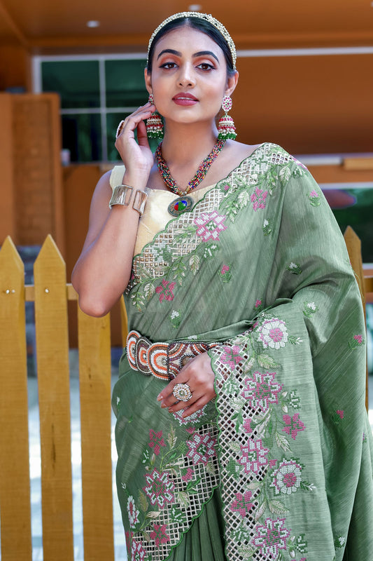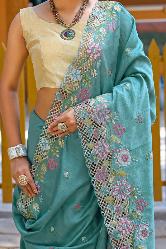 Mint Green Embroidered Pure Mark Silk Saree with Cutwork Border
