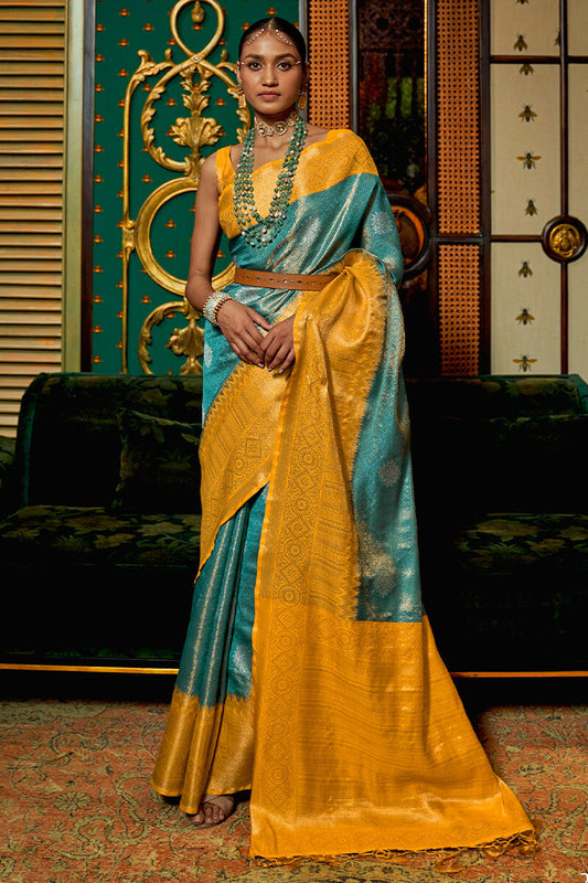 Greenish Blue And Yellow Kanjivaram Silk Saree