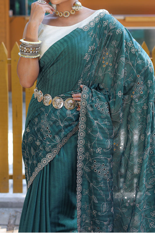 Dark Green Threadwork Soft Silk Saree with Cutwork Border