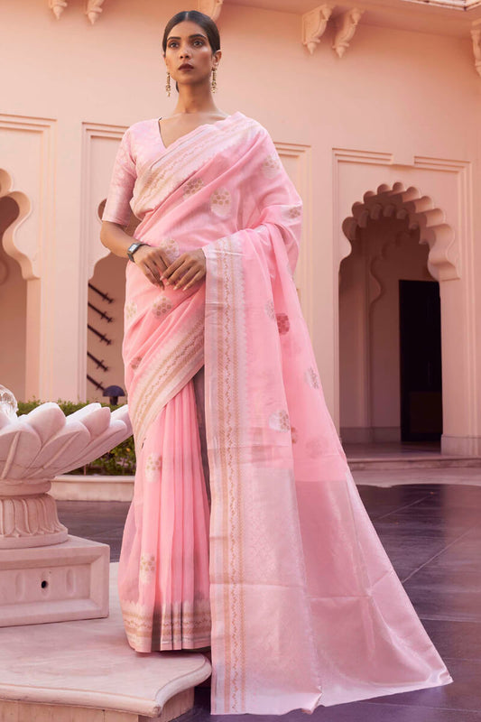 French Rose Pink Zari Woven Satin Silk Saree
