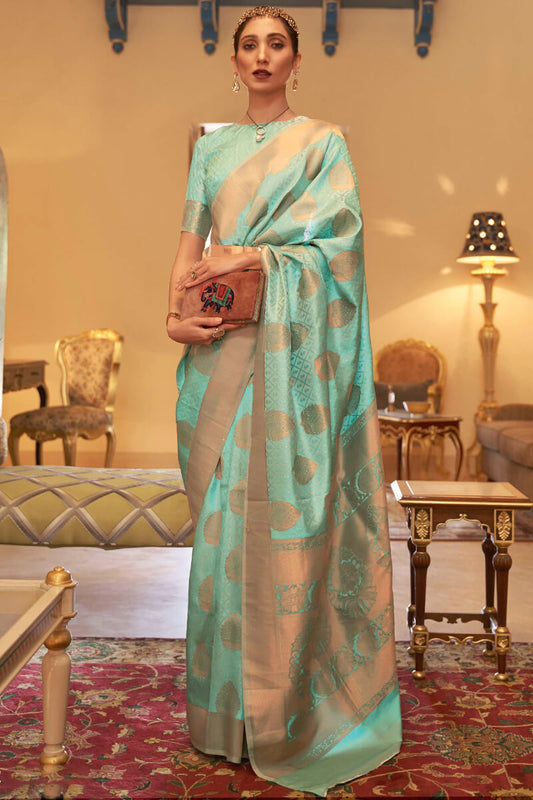 Turquoise Blue Zari Woven Satin Silk Saree