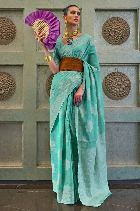 Tiffany Blue Lucknowi Woven Chikankari Saree