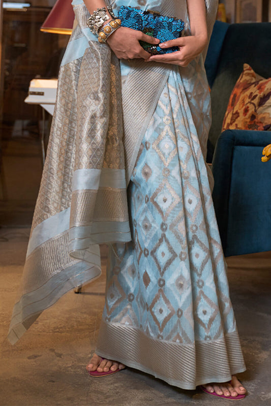 Day Sky Blue Zari Woven Linen Silk Saree