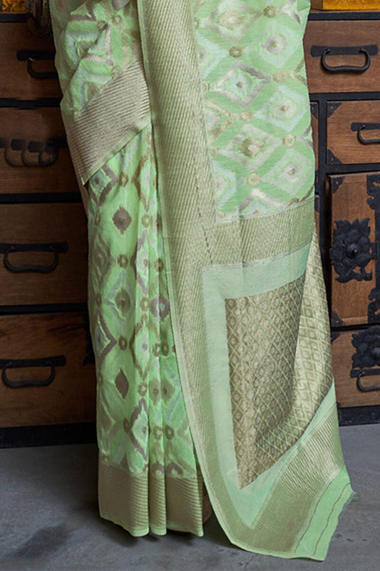 Light Moss Green Zari Woven Linen Silk Saree