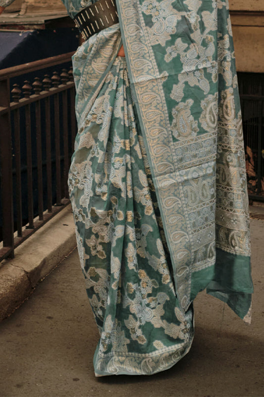 Lunar Green Zari Woven Handloom Banarasi Silk Saree