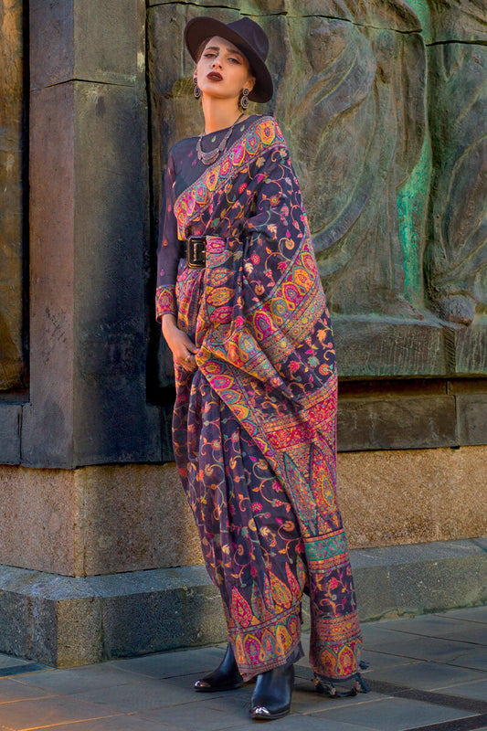 Charcoal Grey Kashmiri Weaving Organza Silk Saree
