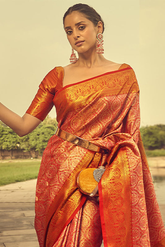 Coral Red Banarasi Satin Silk Saree