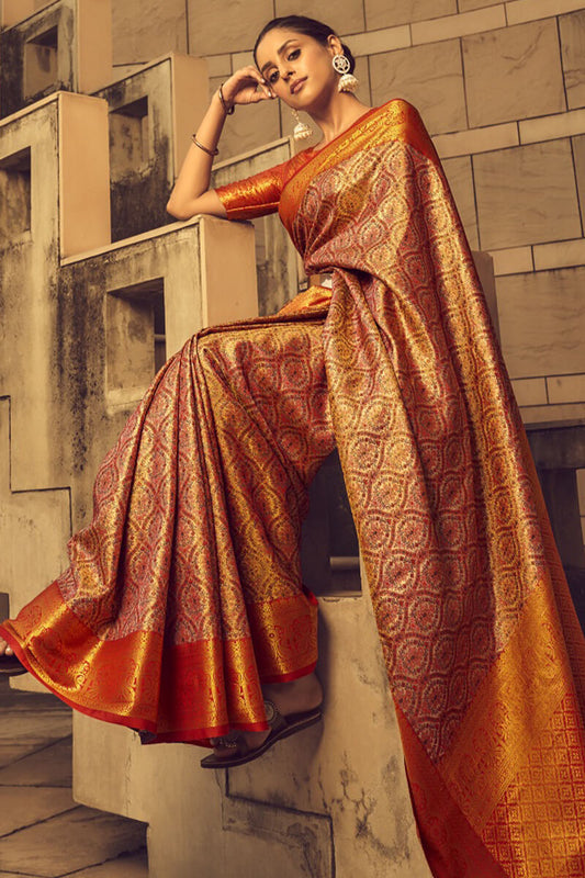 Rusty Red Woven Banarasi Brocade Silk Saree