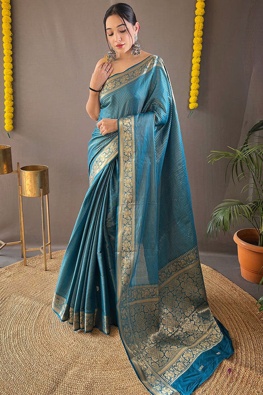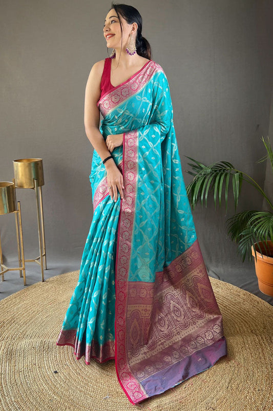 Aqua Blue Zari Woven Banarasi Silk Saree