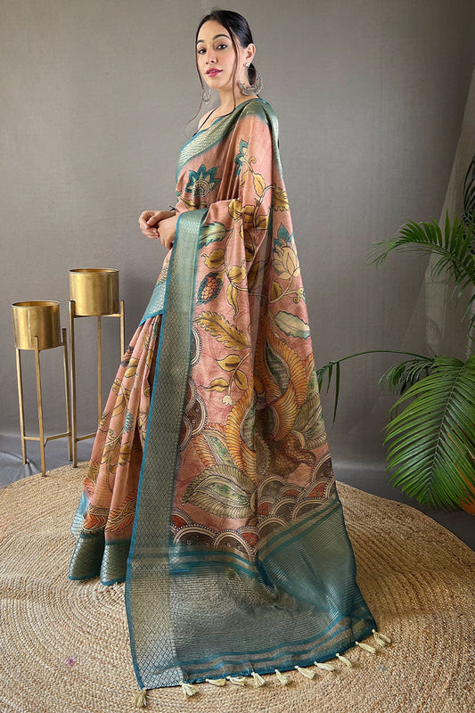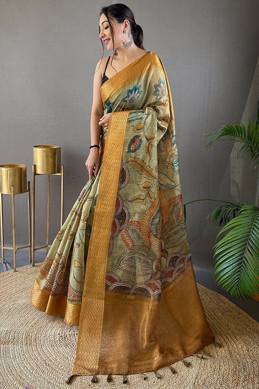 Iguana Green Kalamkari Printed Tussar silk Saree