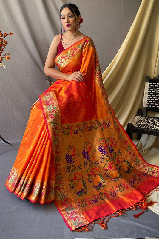 Flame Orange Zari Woven Paithani Silk Saree