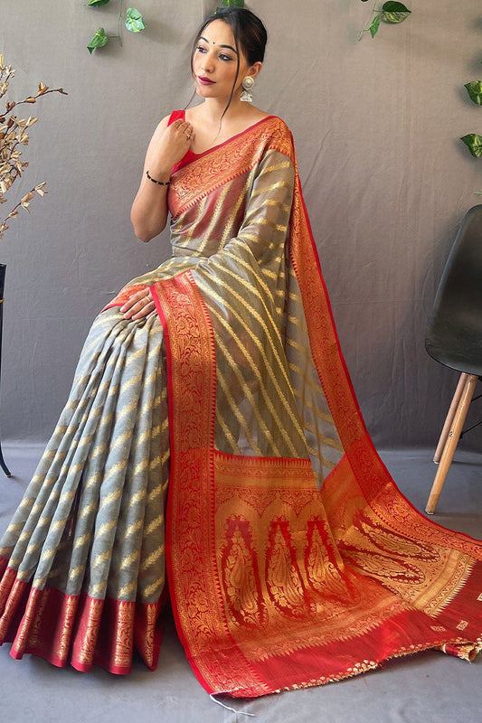 French Grey Zari Woven Organza Silk Saree