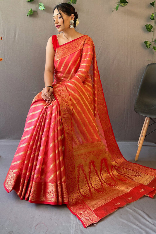 Peachy Pink Zari Woven Organza Silk Saree