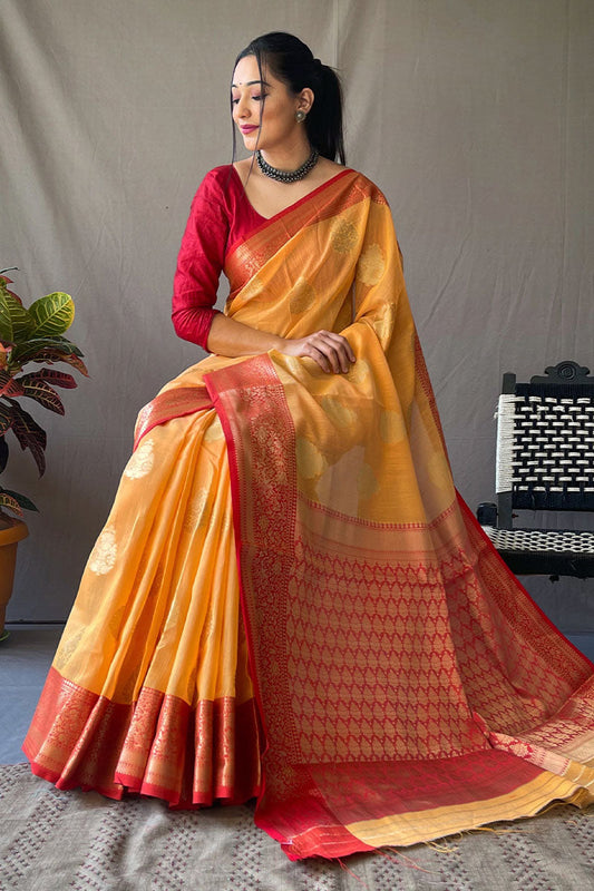 Mikado Yellow Zari Woven Linen Silk Saree