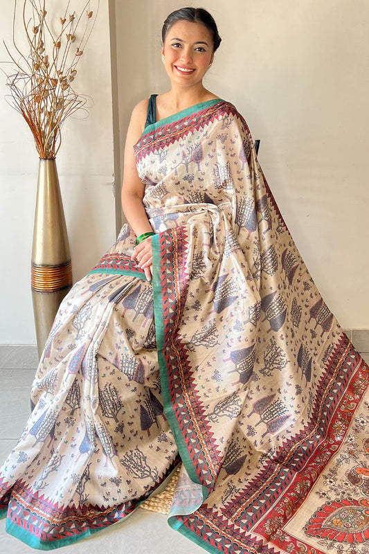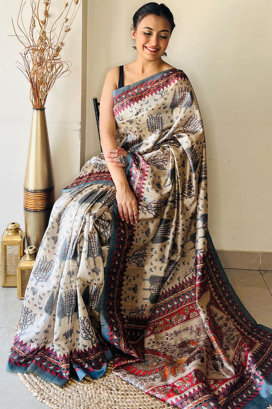 Beige and Grey Kalamkari Printed Soft Silk Saree