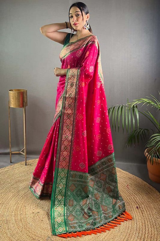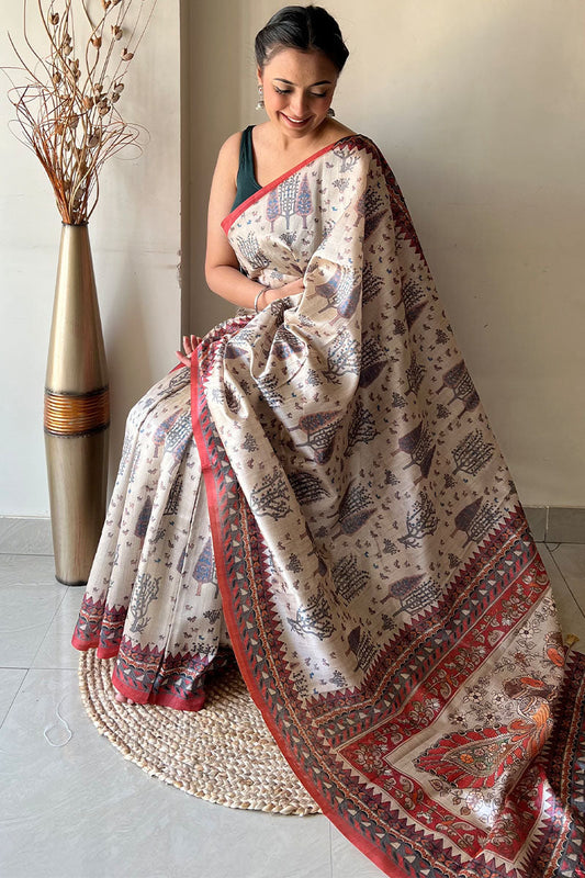 Beige and Red Kalamkari Printed Soft Silk Saree