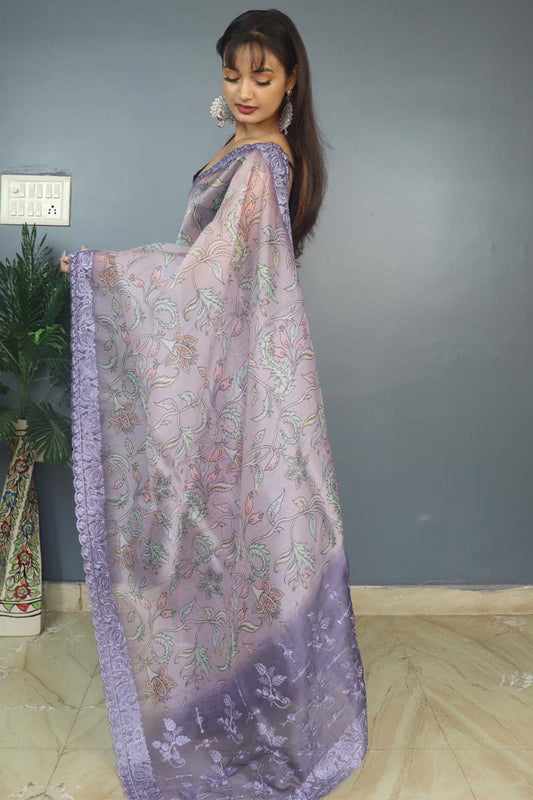Languid Lavender Kalamkari Printed Organza Silk Saree