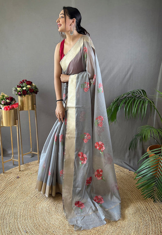 Cadet Grey Kalamkari Printed Organza Silk Saree
