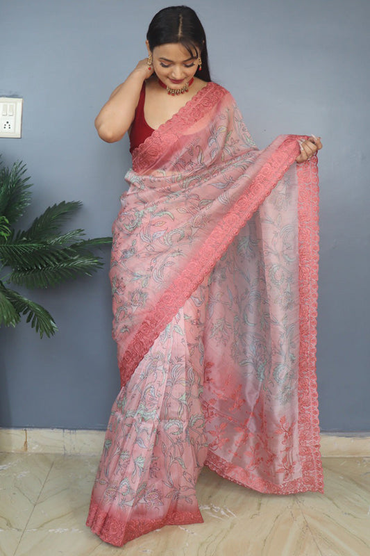 Dusty Pink Kalamkari Printed Organza Silk Saree