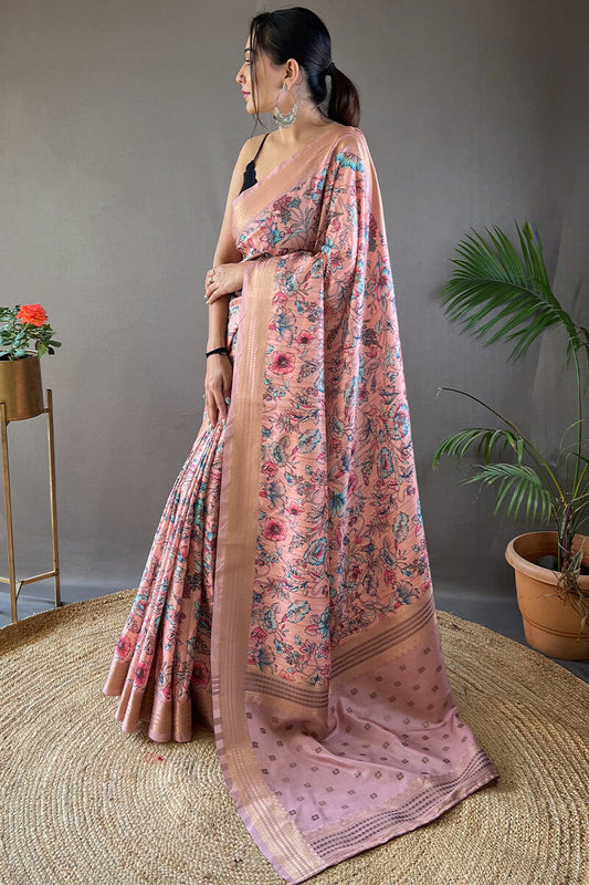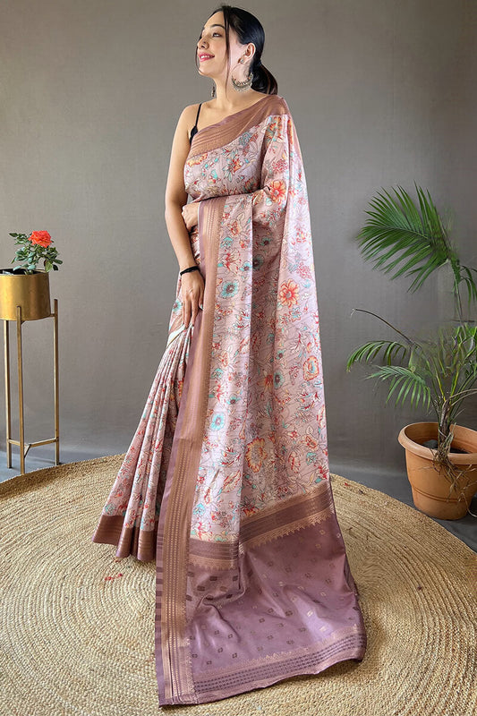 Cameo Beige Zari Woven Printed Soft Silk Saree