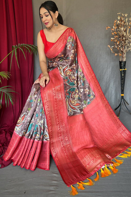 Valentine Red Kalamkari Printed Soft Silk Saree