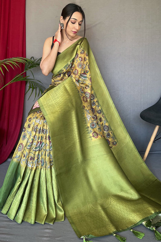 Iguana Green Kalamkari Printed Soft Silk Saree