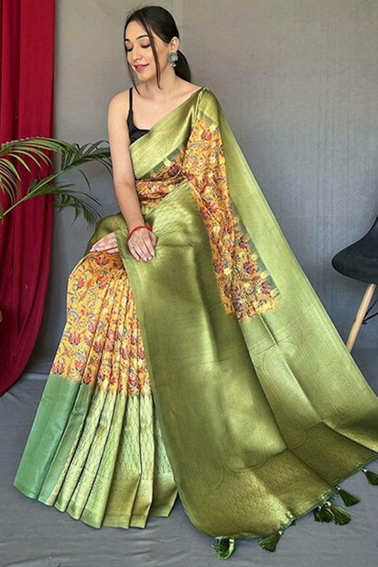 Mustard Yellow Kalamkari Printed Soft Silk Saree
