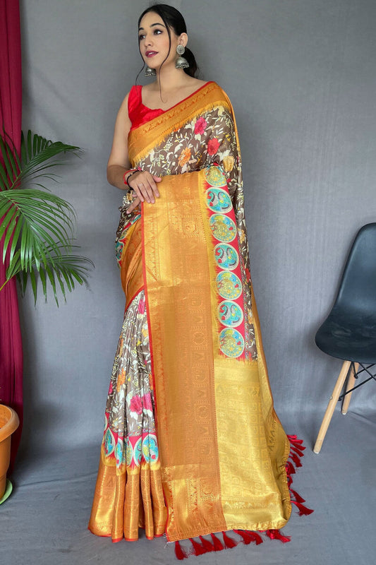 Pastel Brown Kalamkari Printed Soft Silk Saree