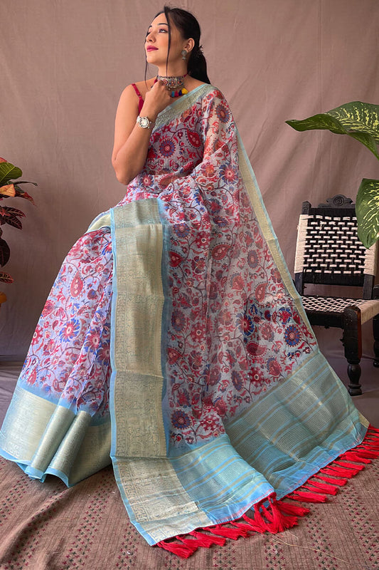 Baby Blue Kalamkari Printed Organza Silk Saree