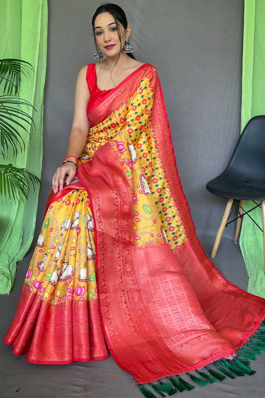 Arylide Yellow Kalamkari Printed Soft Silk Saree