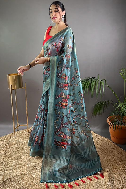 Fountain Blue Kalamkari Printed Organza Silk Saree