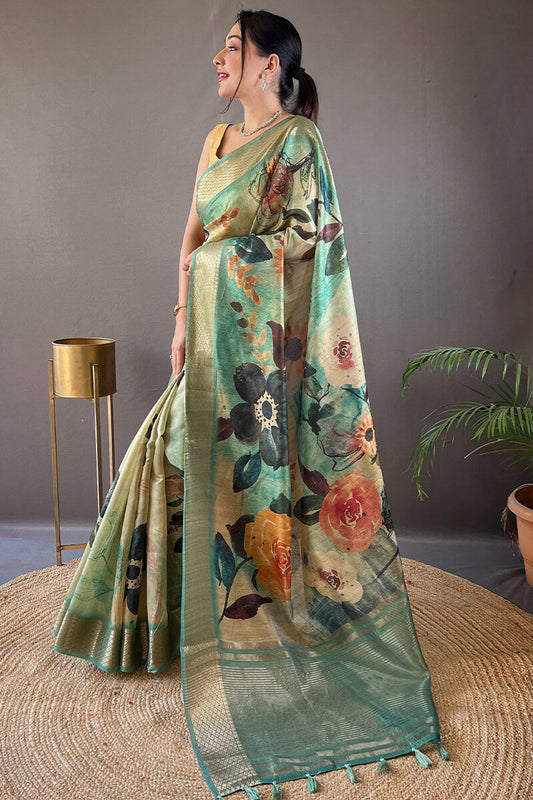 Turquoise Green Zari Woven Printed Tussar Silk Saree