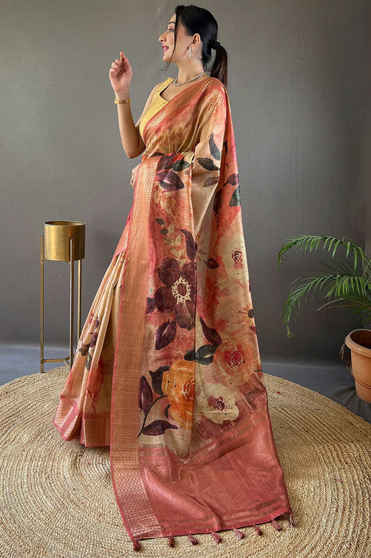 Sandy Brown Zari Woven Printed Tussar Silk Saree