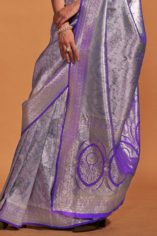 Grey and Purple Zari Woven Kanjivaram Silk Saree