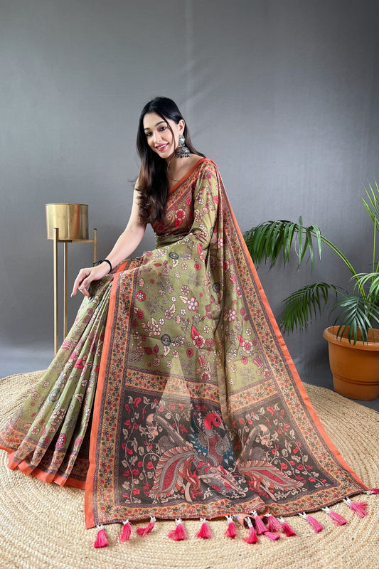 Mehndi Kalamkari Printed Malai Cotton Saree