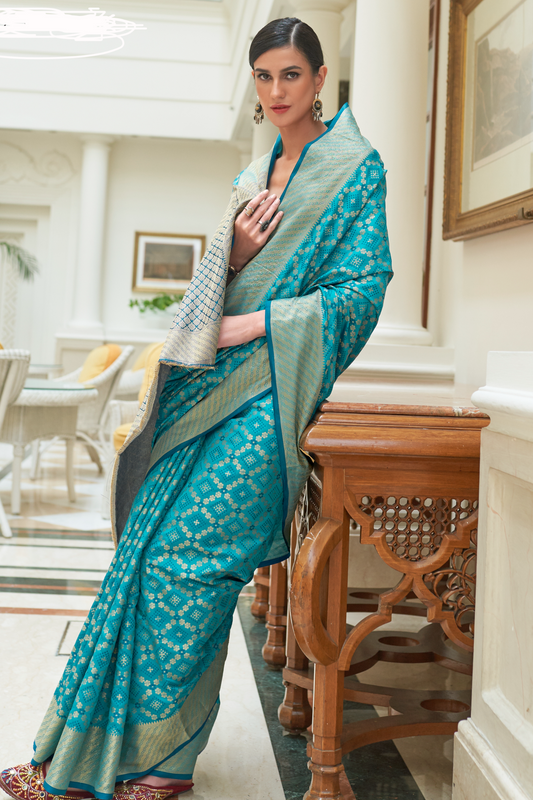 Turquoise Blue Navy Pure Banarasi Katan Silk Saree with Handloom Weaving