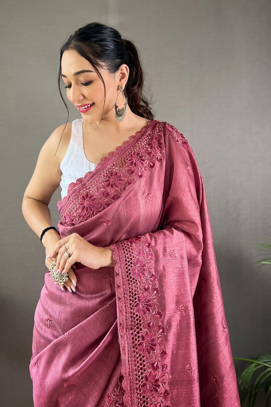 Wine Matka Soft Silk Saree with Floral Cutwork Border