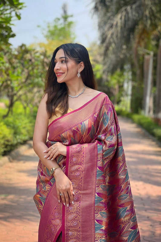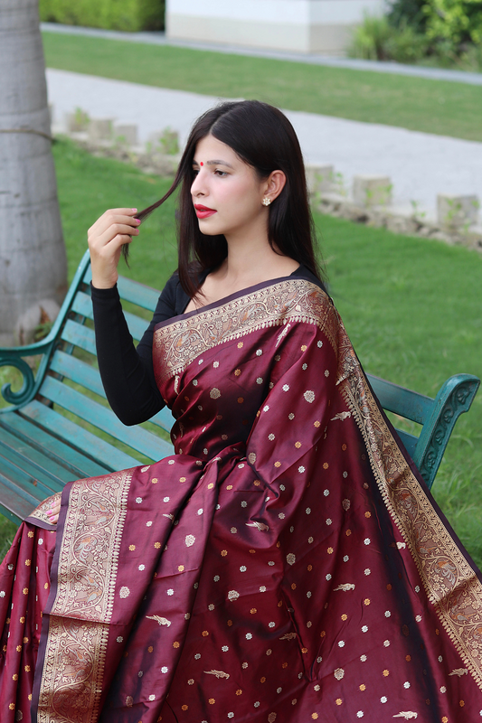 Wine Banarasi Soft Silk Saree with Copper Zari Border