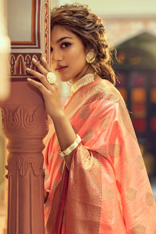 Salmon Peach Lavish Banarasi Handloom Silk Saree with Tassels Pallu